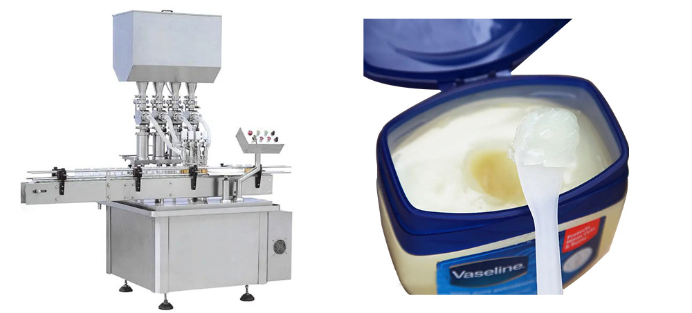 This Automatic Vaseline Filling Line includes automatic 6 heads filling machine with heating and stirring, cooling tunnel, cap pressing machine with cap loader, double side labeling machine, date printer and heat shrinking packing machine. Suitable for cosmetic paste filling machine such as Vaseline.